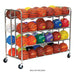 Keep your basketballs organized and easily accessible with the Champion Sports Double Wide Ball Cart. It is a perfect way to store and transport all of your basketballs or other playing balls. This heavy-duty cart is constructed with 1" chrome plated steel tubing and features a four-tier design that holds up to 48 balls (eight rows with 6 balls each). Made with heavy-duty steel tubing and locking swivel casters, it can withstand even the most rigorous use. The locking swivel casters provide smooth rolling and will not mar gym floors, making it easy to move around the gym or court. The cart measures 55.5"L, 24"W and 46.5"H. *Balls sold separately.