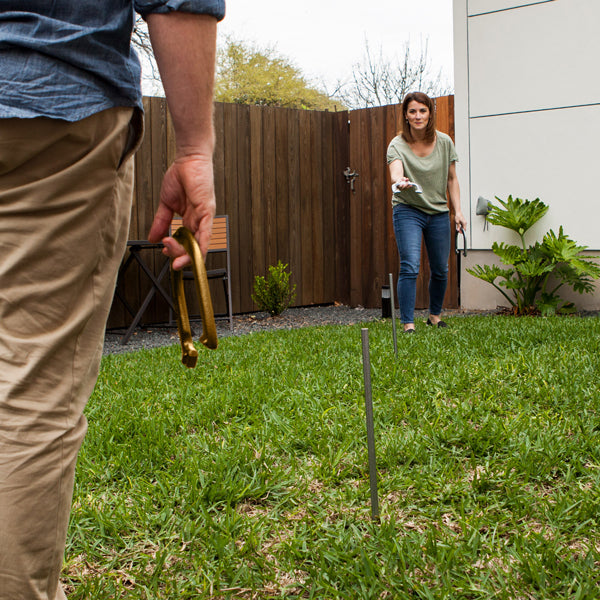 Liven up your next outdoor gathering and play an authentic game of horseshoes in the backyard or at the campsite with the Champion Sports Steel Horseshoe Set. This complete set includes: four standard weighted powder-coated steel horseshoes for longevity and an authentic feel; two solid steel stakes that are easy to drive into the ground for quick setup for traditional-style play. Carry the game in the handy reusable nylon carry bag.