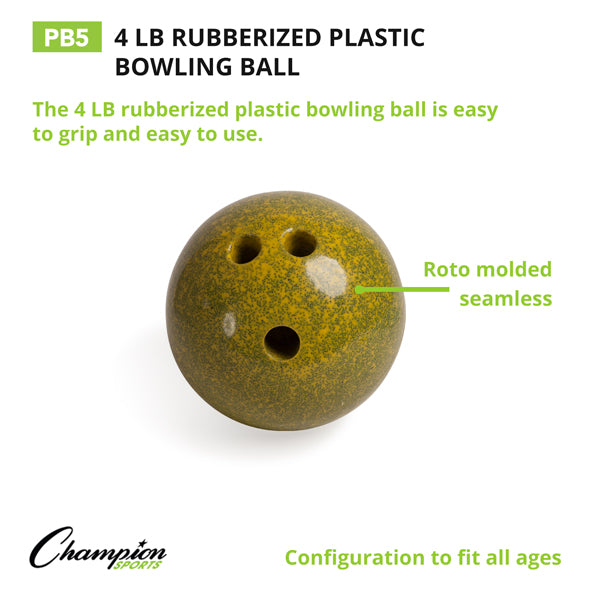 The Champion Sports Plastic Rubberized Bowling Ball is a roto-molded seamless bowling ball that is easy to grip and fun to use! The perfectly round finger holes are great for all ages, and these bowling balls can be used with any plastic or foam pin set to teach kids bowling basics.
